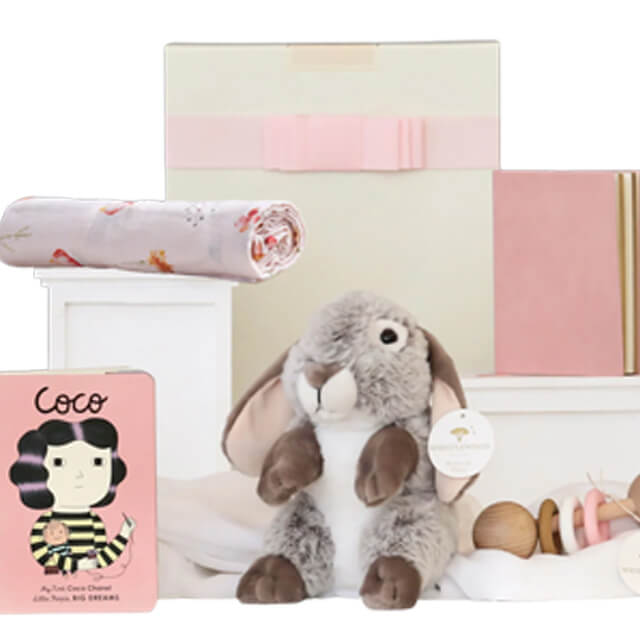 Little baby girls with big dreams will love this baby hamper themed around the iconic Coco Chanel. It features a book that tells her story, plus Buttons the Bunny and a Beechwood Rattle in pink. Storytime is a magical memory parents treasure, give that memory with this baby girl hamper.