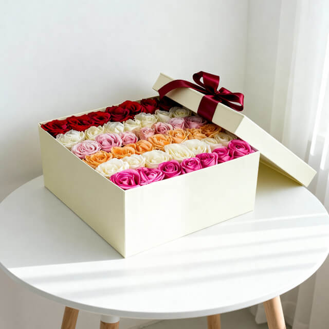 Discover the ultimate expression of love with our box of mixed roses, featuring 5 stunning shades of roses! Each Each shade of rose, from vibrant red to delicate pink and classic white, represents a unique emotion, creating a bouquet that’s both visually stunning and meaningful.