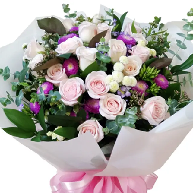 Soft pink roses with purple flowers, and some spray white flowers. This mixed hand bouquet can be the special gift you have been looking for.