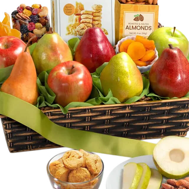Delight in the holiday season with a gift basket brimming with the crisp sweetness of Bosc pears, the refreshing crunch of green pears, and the vibrant allure of red apples. Complement these fruits with the savory richness of cheddar cheese alongside sea salt and olive oil crackers, creating a symphony of flavors perfect for festive gatherings or cozy nights by the fire. An ideal present to savor and share during the joyous holiday celebrations.