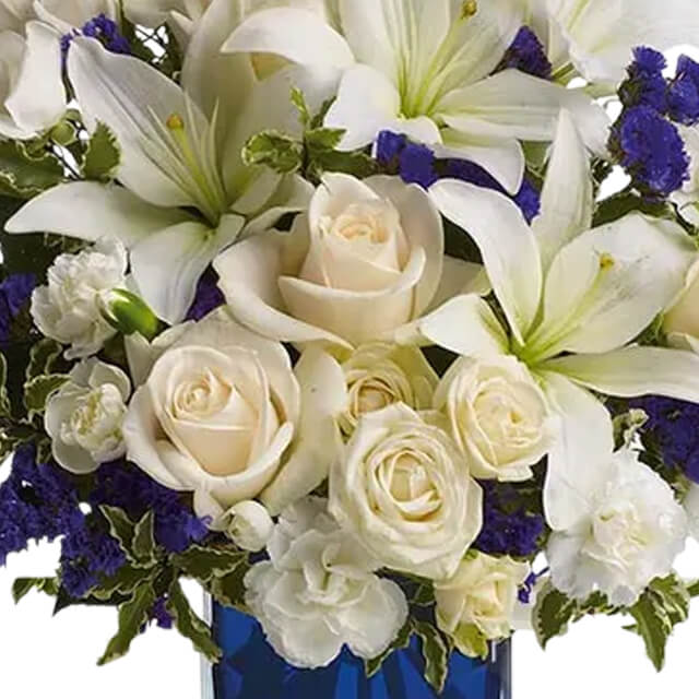 Nature’s perfect day captured in flowers! This uplifting arrangement mirrors a cloudless summer sky with pristine white lilies glowing like sunlight, surrounded by creamy roses and wispy purple statice – like distant mountain wildflowers. Presented in a refreshing blue cube vase, it brings the tranquility of wide open spaces to any room.