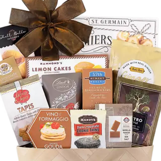 Send this sweet and savory collection of baked crackers, smoked Gouda cheese spread, Italian snack crisps with olives, vanilla sea salt caramels, puff pastry, Lindt milk chocolate truffles, vanilla fudge with sea salt, chocolate cookies, madeleine and lemon cakes, sweet and spicy ginger chews and olives will help convey your well wishes.