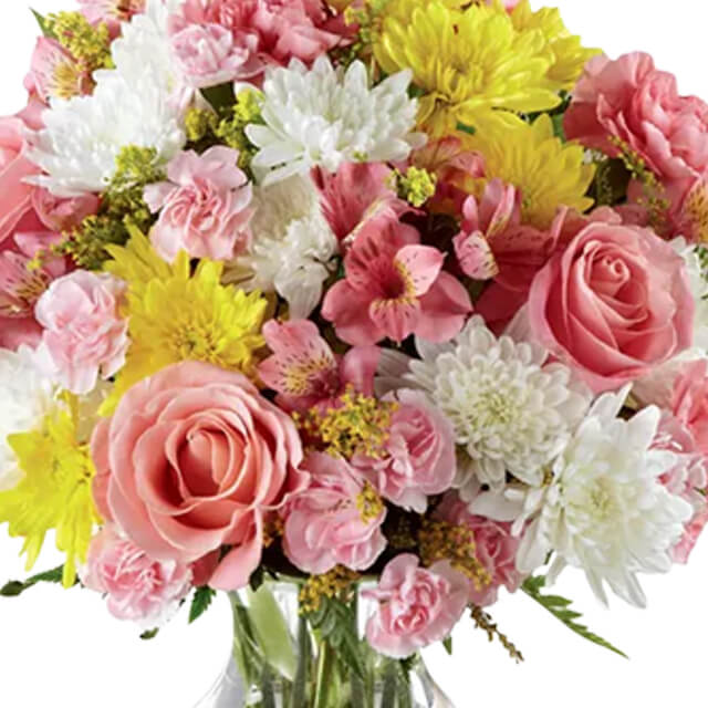 Beckoning with sunlit grace and beauty, this warm and uplifting bouquet is ready to offer cheer and flowering elegance to your recipient today. A collection of pink. yellow. and white blooms, including alstroemeria, carnations, and roses, are highlighted in this lovely bouquet to create a wonderful birthday, thank you, or get well gift!