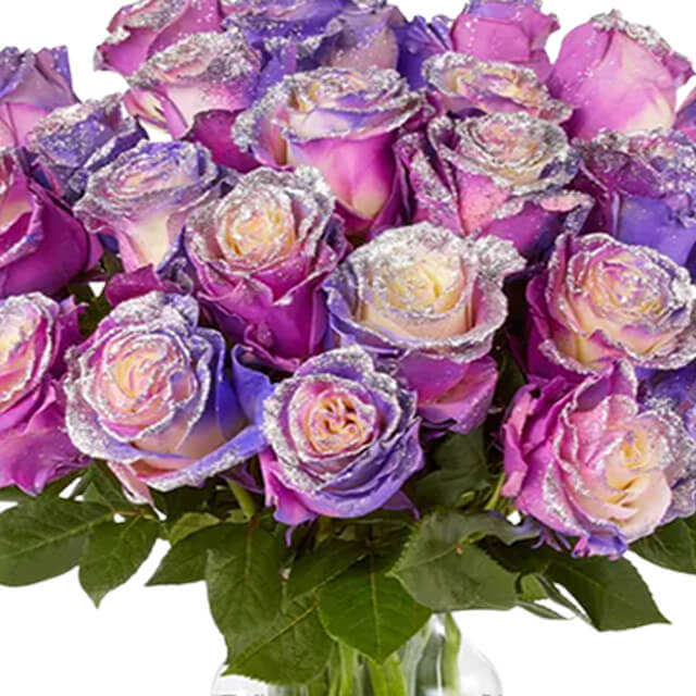 Make any occasion sparkle with this stunning bouquet of two dozen purple roses, beautifully accented with a dusting of iridescent glitter. Each bloom features rich purple hues and shimmering details that catch the light, creating an enchanting display. Arranged with fresh green leaves in a classic optional clear glass vase, this dazzling bouquet is perfect for celebrations, special moments, or simply adding a touch of magic to any space.